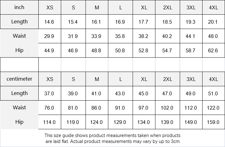 3XL: Length 19.3 - Waist 44.1 - Hips 58.7